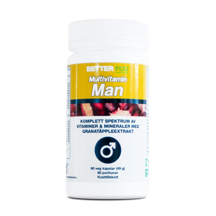 Better You Multivitamin Man zawiera łatwo przyswajalne witaminy i minerały, które stanowią uzupełnienie codziennej diety. Jest to preparat kompletny pod względem składu, co oznacza, że zawiera również minerały takie jak miedź i bor, których zazwyczaj nie zawierają preparaty multiwitaminowe nie występujące naturalnie. Zawiera również granat.